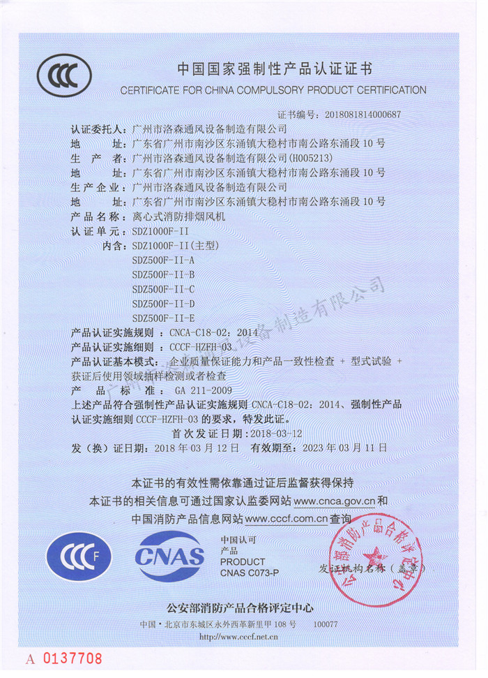 • CCCF證書(shū)-洛森風(fēng)機(jī)180314離心式消防排煙風(fēng)機(jī)SDZ1000F-II(SDZ1000F-II~SDZ500F-II-E)